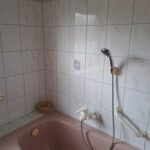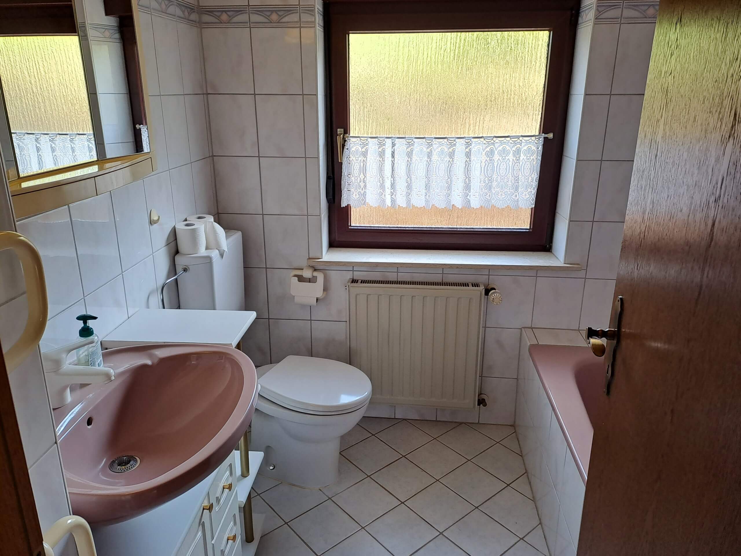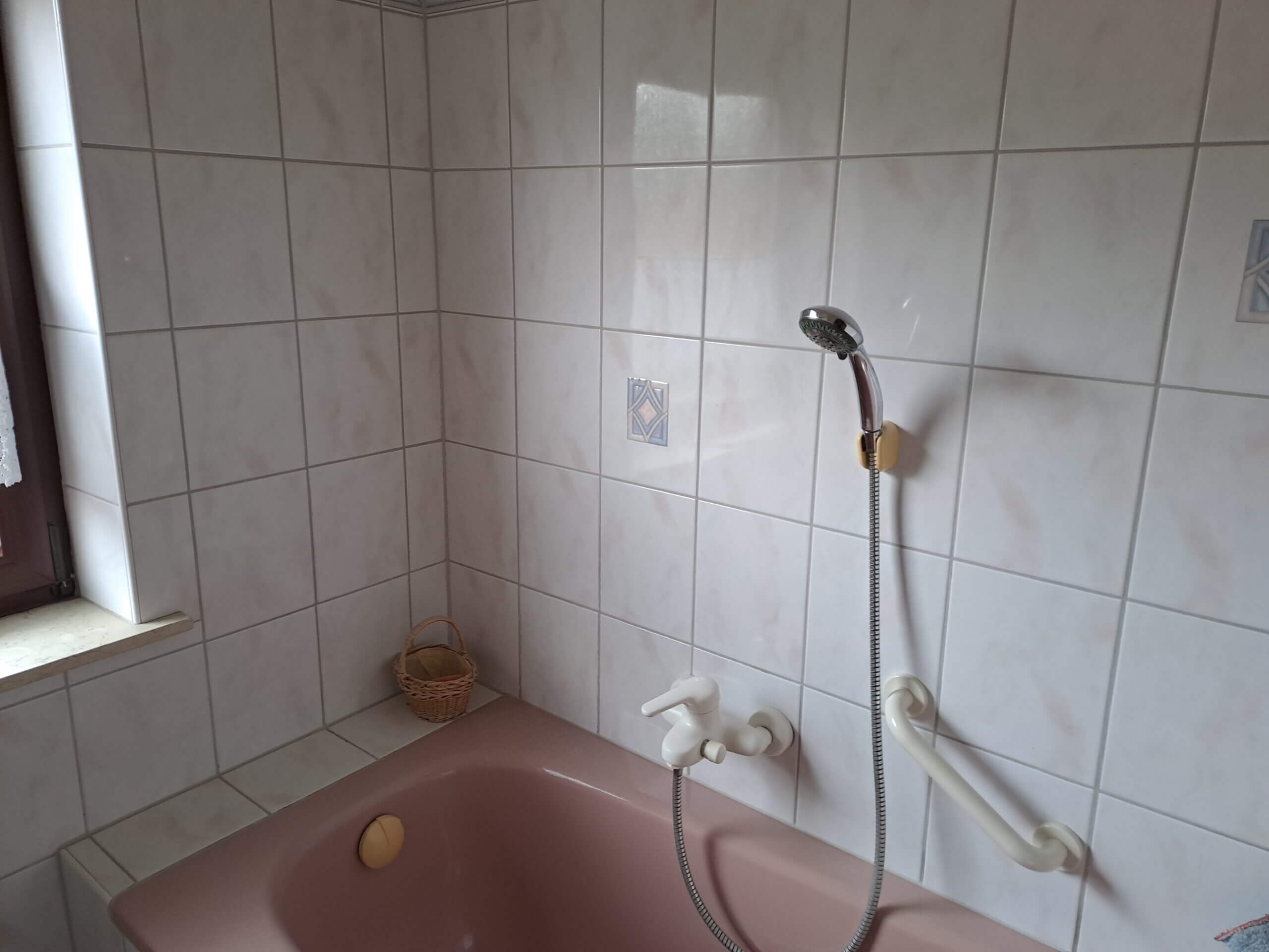 Im Badezimmer wurde Fliesenmaterial an Böden und Wänden verlegt.
